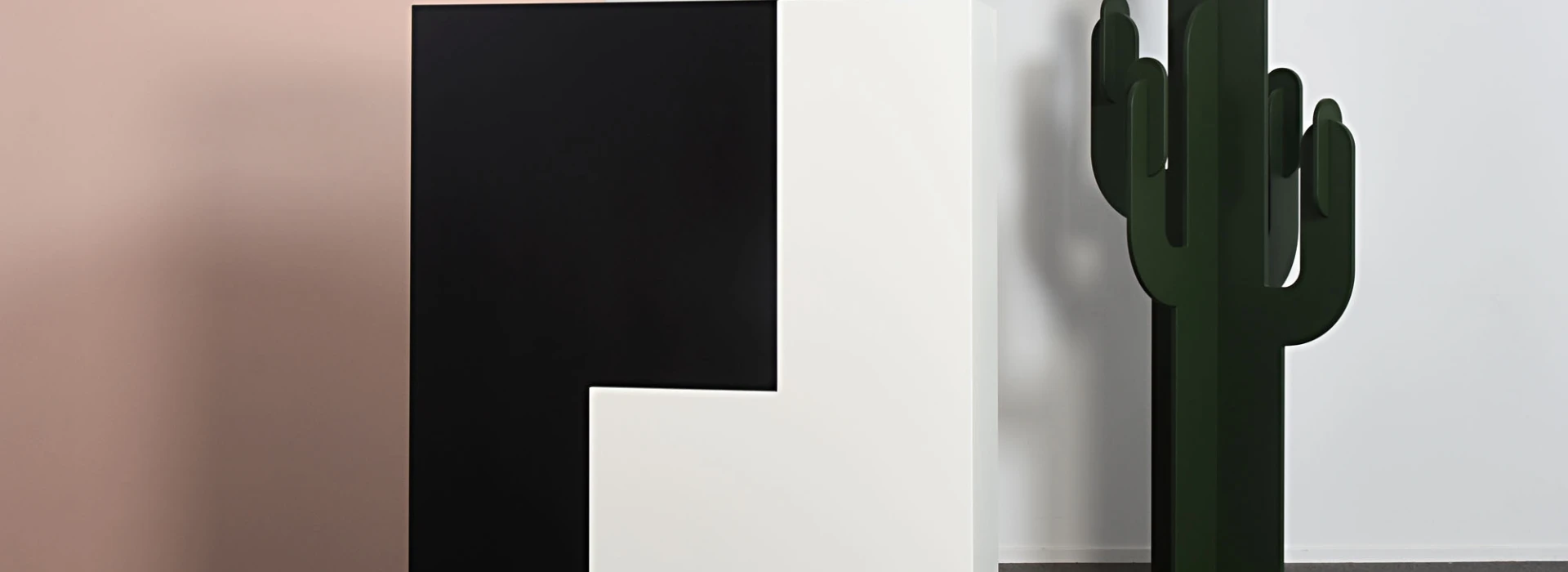 Staand is de L-vorm een kast met deur, liggend is het een dressoir met laden. Samen met een al even verfijnd gedetailleerd rechthoekig kastje en twee maten open nisjes, kan eindeloos gecombineerd worden.