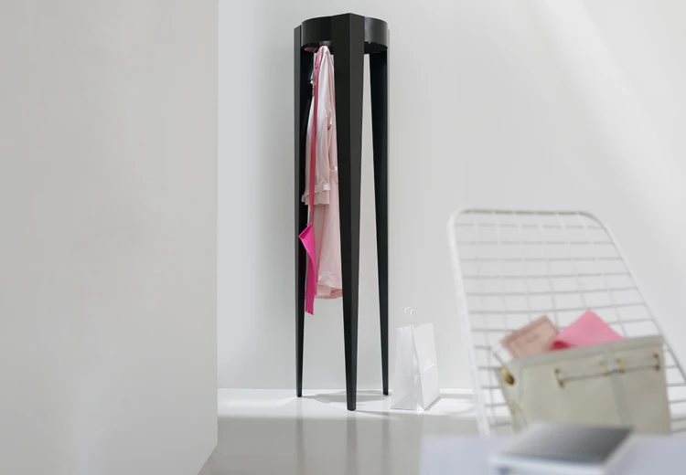 Vind meer producten in onze showroom Plan een adviesgesprek Informatie aanvragenKapstokken verdwijnen meestal uit beeld als ze worden gebruikt. Daarom is de kapstok binnenstebuiten gekeerd, zodat het ontwerp altijd zichtbaar blijft.