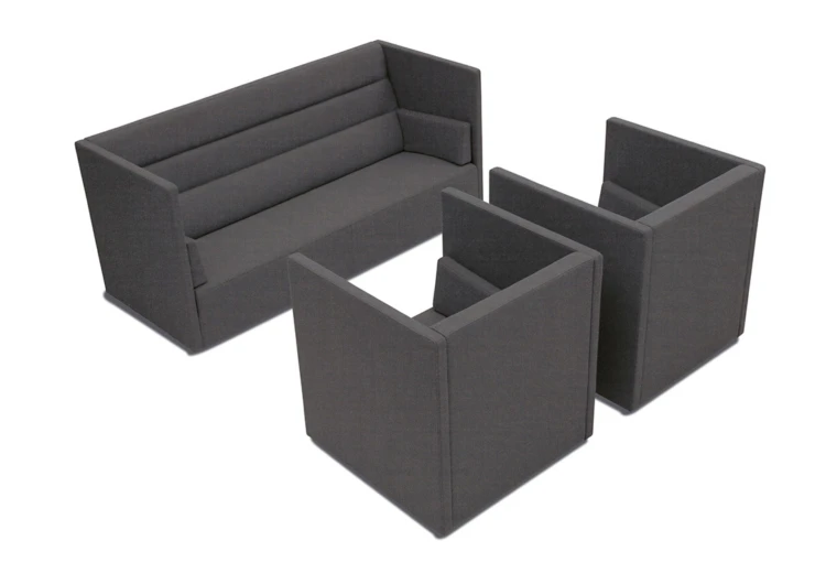De Float loungebank van Offecct heeft een hoge rug. Samen met de uitstekende akoestische dempende waarde worden gesprekken goed gedempt.