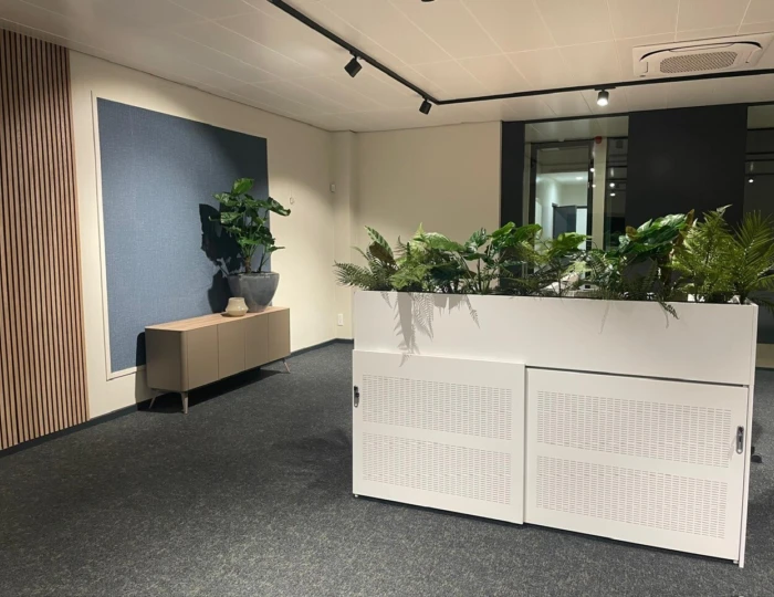 De moderne kantoortuin met een open structuur vraagt om passende akoestische oplossingen. De Voortman Sound & Vision schuifdeurkasten zijn voorzien van geluidsabsorberende akoestische foam in de schuifdeuren en een plantenbak.