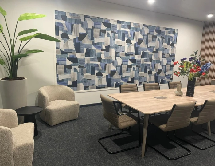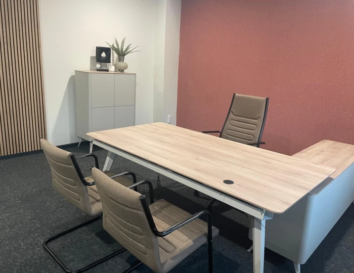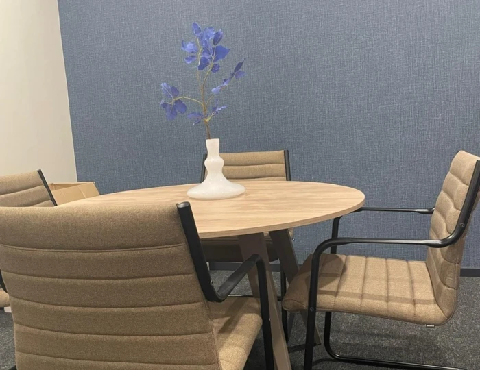 De vergaderruimtes zijn ingericht met stijlvolle stoelen en een bijpassende Voortman Tabs vergadertafel met inbouwelektrificatie.
