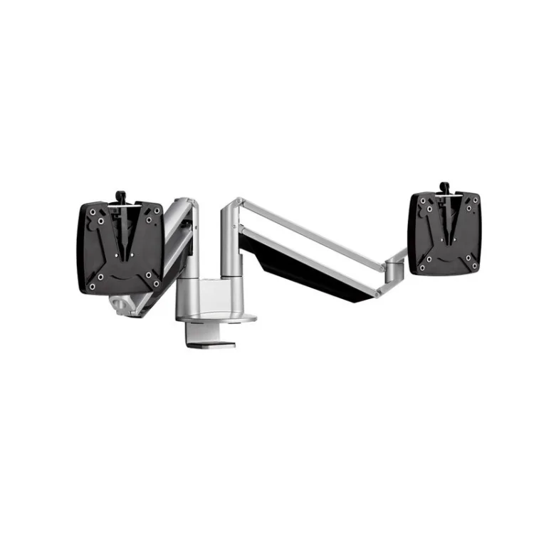 - De Crossbar heeft 2 Vesa bevestigingen voorzien van een element voor een traploze verstelling van de hoek en de mogelijkheid de twee beeldschermen, tot een maximale beeldschermmaat van 27″, onafhankelijk van elkaar te draaien.