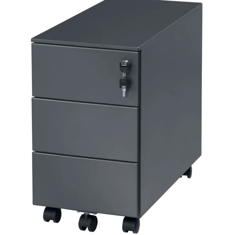 Smal verrijdbaar ladeblok met 3 laden. Dit metalen ladeblok is de ideale oplossing om je werkplek georganiseerd te houden. Dankzij het compacte formaat (53,5 x 30 x 50 cm) past het eenvoudig onder vrijwel ieder bureau, terwijl de drie ruime lades genoeg opbergruimte bieden voor documenten, kantoorbenodigdheden en persoonlijke spullen.