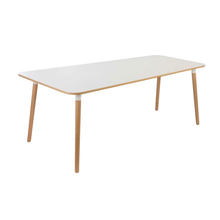 De Vepa Skeef tafel heeft een zachte uitstraling. De ruim afgeronde hoeken en de tabs toe lopend blad benadrukken dit. Het showroommodel is nu in de aanbieding. Het laatste model is nu afgeprijsd van € 615,- voor € 200,- Het showroommodel heeft een bladafmeting van 180 cm lang en is aan de ene kant 100 cm diep en aan de andere kant 80 cm. Het blad is 18 mm dik en is melamine wit.